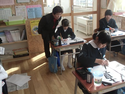 5年生は、田丸さん、余野木さんのお二人に毛筆を習いました。西田幾多郎先生に関する4つの言葉「道」「真理」「無」「誠実」を練習しました。完成した作品は2月に西田幾多郎記念哲学館に掲示されます。