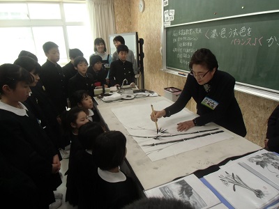 6年生は、蘭墨会の3名の方々に水墨画を習いました。佐蘭先生の見事な筆さばきに子ども達は見入っていました。完成した作品は校内に掲示しますので、25日(土)の授業参観に見に来て下さい。