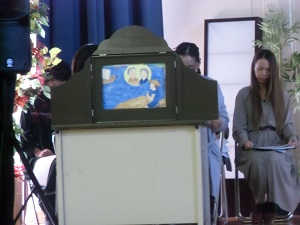 文化祭で披露 投稿日時 : 2019/10/21 soto1 唐仁屋三郎兵衛の紙芝居を白尾文化祭で披露しました。図書ボランティアの皆さんは、開始1時間前に集合し、練習してから本番に臨みました。回を重ねるごとに上手になっています。会場の皆さんも熱心に聞いて下さいました。今後はDVD化して、手軽に視聴できるようにしていきたいと思います。興味のある方は、学校まで連絡下さい。 Tweet {{options.likeCount}} {{options.likeCount}} 0 コメント