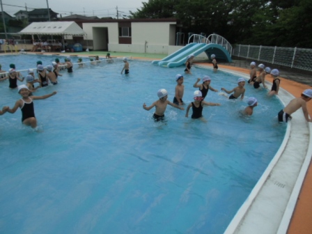 プールが始まり、水の中で動物のまねっこ歩きをしたり、じゃんけん列車をしたり、少しずつ水に慣れてきました。