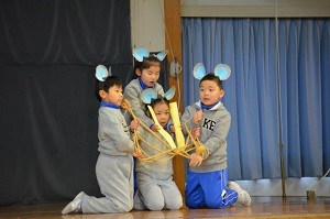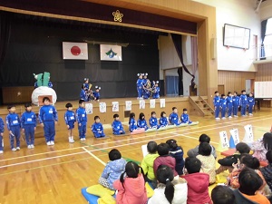 年長さんが楽しみ、喜んでもらえるよう一生懸命、準備や練習をしてきました。歌や得意技披露、音楽劇、お勉強、プレゼントわたし、学校探検など、どれもかっこいい1年生の姿を年長さんに見せることができました。また、年長さんに声をかけたり手を貸してあげたりする優しい姿も見られました。