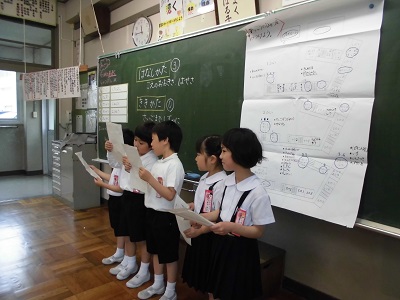 それぞれのグループで見つけてきた「ひみつ」を絵に描いたり、クイズにしたりして発表することができました。