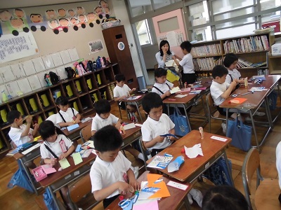 7月7日は七夕。今日は笹に七夕飾りをしました。まずは短冊。「いしゃになりたいな。」「さつまいもがおおきくそだちますように。」「かぞくがけんこうですごせますように。」など思い思いの願いを書いていました。飾り作りでは、「ちょうちんつくろう!」「わっかにしようかな。」など言いながら楽しそうに作っていた子どもたちでした。