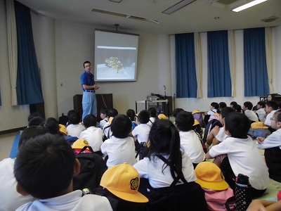 飼育員さんに「海のかくれんぼ」の説明をしていただきました。海の生物たちが、どのように隠れているのかの詳しい説明を聞きました。パワーポイントを見ながら「あっ!そこにおる!!」「え~わからん・・・」と真剣にきいていた子どもたちでした。水槽を見るときも隠れている生物を探していました。