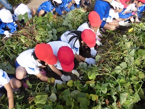 春頃に植えた、サツマイモが厳しい夏を越え、たわわに実りました。