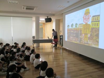 平和学習の様子です。絵本の読み聞かせをしました。真剣に聴き、平和が続いてほしいという