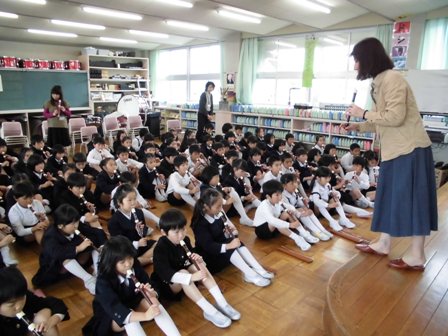 音楽では3年生からリコーダーが始まりました。きれいな音を出すためのポイントなどを教えてもらいました。講習会では、いろいろなリコーダーを見せてもらい、きれいな音色を聴かせてもらいました。子どもたちは目を輝かせ、「私もこんな音を出したい!!」と真剣に練習をしていました。