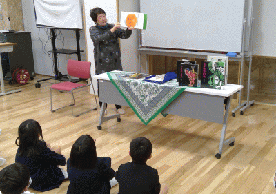 1月20日の5限目に、図書ボランティアさんによる、「やまんばさんのお話会」がありました。さまざまな童話や詩の読み聞かせをしていただきましたね。「もちのかぞえうた」の紙芝居では、いろいろなお餅を紹介してもらいました。他にも、季節を感じる「ふゆのまつり」の詩や、270以上もの粒がある「みかんのひみつ」、大きな山のせいで半日しか日が当たらない「半日村」のお話、ろうそくを灯して聞いた「北欧の童話」など、時間があっという間に過ぎるお話会でした。今後も、同じ作者が書いた他のお話の本を借りて読むなどして、読書の世界をより広げられるといいですね。