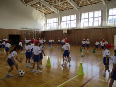 体育の授業では、「ボールゲーム」の単元でサッカーをしています。