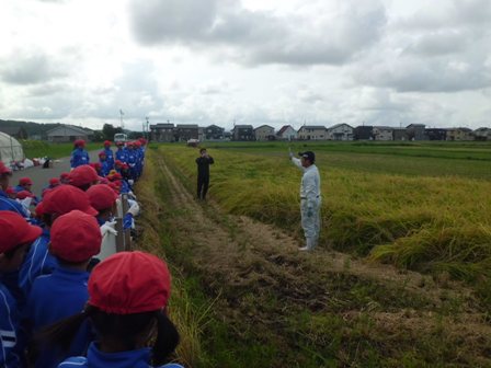 5月に田植え体験をさせていただき、今日には大きな稲穂となった姿をみて子供たちは、驚きの表情を見せていました。 これまでに、渡辺さんの日々の努力や苦労があって立派な稲穂になることを肌で感じれたことは非常に大きな経験になったように思います。毎日当たり前のように食卓に出される様々な食材も、人々の努力と工夫、想いが詰まっている宝物であるという意識をもち、日々の食事のことを考えてもらえればうれしいなと思いました。