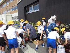 地域の皆さんに教えていただきながら子どもたちは一生懸命フジバカマを植えかえていました。