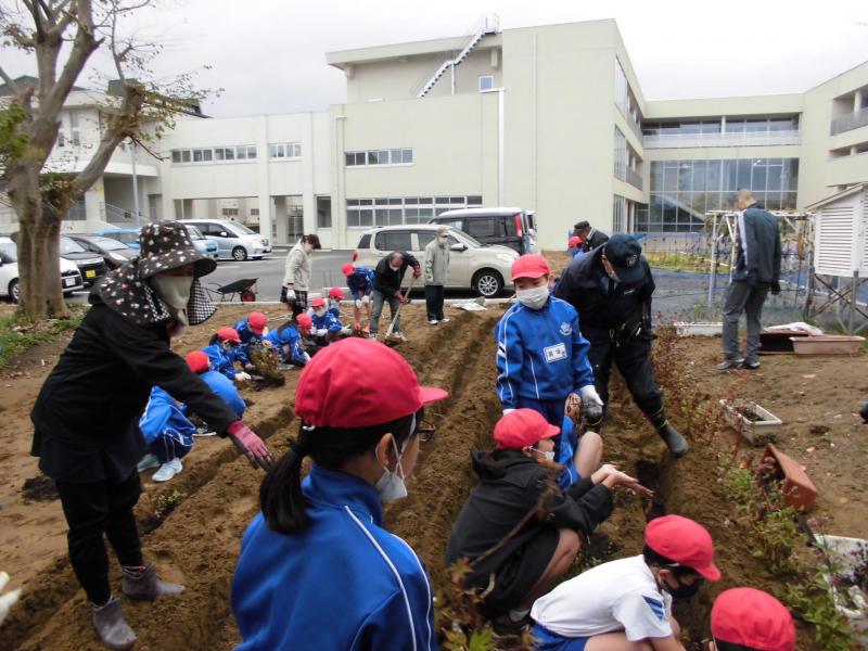 「どうしたらいいんだろう?」と初めは緊張した様子の子どもたちでしたが、植える間隔や土のかけ方などを習い、コツをつかむと夢中になって取り組んでいました。
