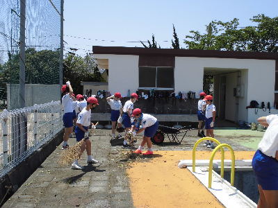 そして今日、3~4限にプール掃除を行いました。5年生は、主にトイレや更衣室の掃除、