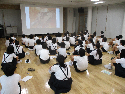 学年集会では、9月9日に控える体験学習の話、運動会の話、平和に関する話を聞きました。