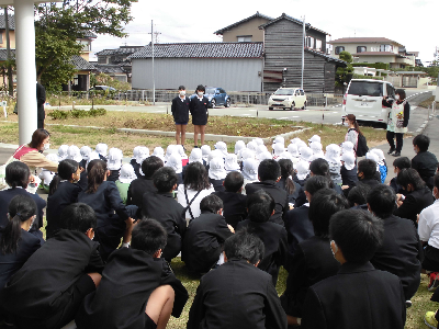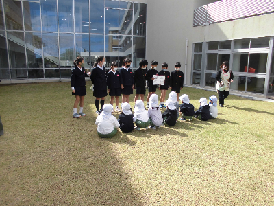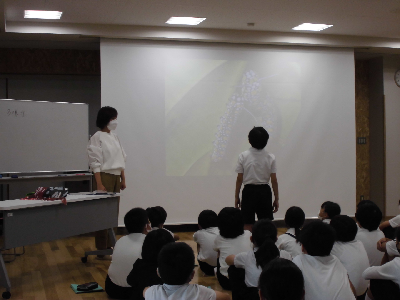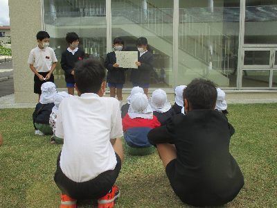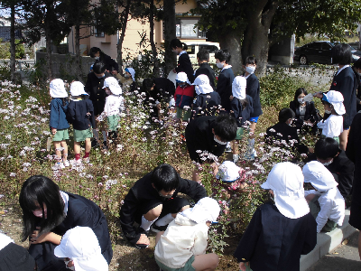 5年生から、フジバカマやアサギマダラについて説明した後、学校園にあるフジバカマを園児のみなさんと