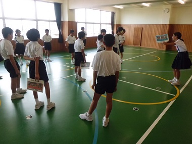英語の勉強では、道案内の仕方について学習しています。turn~、go~などの表現を使って友達と交流を楽しんでいます。