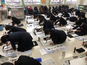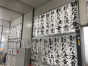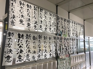 今日から、新学期ということで、毎年恒例の校内書き初め大会がありした。今年は最後の書き初め大会ということで「新たな決意」という字を書きました。新年の決意もあれば、中学生に向けての決意…。様々な決意をこめて力強く書いていました。