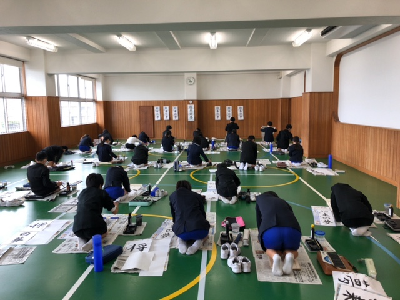 書写の時間です。書き初め練習が始まりました。6年生の課題は、「将来の夢」です。
