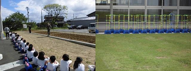 駒井先生に植え方を教えてもらいながら植えました。また,オクラやナスなどの苗も教えてもらいました。