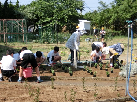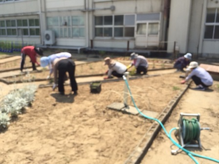 昨日の委員会活動の時間、中庭花壇で花植えが行われました。その際、環境委員のもとに、ありがたい助っ人の皆さんが来て下さいました。花植えボランティアの皆さんです。前回は草むしりで助けて頂き、今回は花植え・・・。一緒に植えながら、教えてもらうので、作業が大変スムーズに進みました。暑い日にもかかわらず、いつも助けて頂き、ありがとうございます。