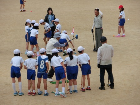 金曜日の2・3限目に、4年生が地域の方々とグラウンドゴルフで交流を行いました。昨年度から始まったグラウンドゴルフを通しての交流。昨年はすみよし公園でしたが、今年は学校の運動場で行うことになり、朝早くから運動場をトンボでならしたり、12のコースをつくって準備をしたりして下さいました。