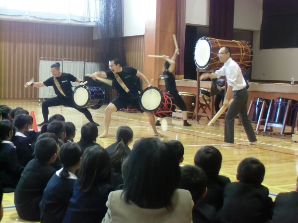 低学年の希望者は実際に太鼓演奏を体験させてもらいました。どの子も演奏を楽しみ満足そうでした。