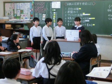<5年生>5年生はクラスを解体し、総合のチーム別にそれぞれの活動を見ていただきました。