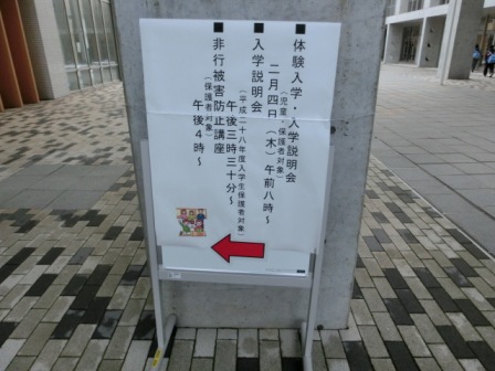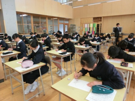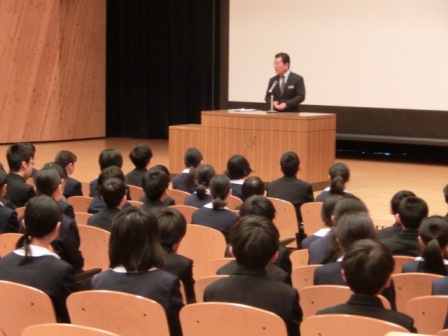 授業体験後は講堂へ戻って入学についての説明(学校生活全般、学習について等)を、担当の先生方から聞きました。特に大事なのは学習の穴をなくす努力をすること、ルールやマナーなどを意識できるように自分を高めること、しっかりした判断力をつけることと話されました。