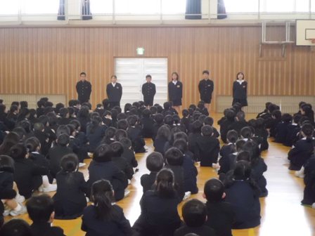 今日の5限目、修了式に先立ち、「卒業式のふり返りと入学式に向けた結団式」を行いました。卒業式では5年生を中心に、みんなで心をこめて立派な歌や呼びかけを行うことができました。その振り返りをしっかり行い、今後に向けて更にレベルアップするための会、それが「結団式」です。5年生の司会のもと、5年生は卒業式で頑張ったこと、1~4年生の様子について、6年生として入学式に向けた在校生への呼びかけの3点を話し、他の学年は、卒業式で頑張ったことと入学式で頑張ることを話しました。とても素敵で、頼もしさを感じる会となりました。