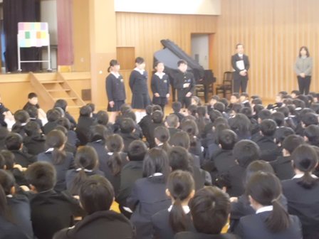 今日の5限目、修了式に先立ち、2つの表彰も行いました。スポチャレいしかわ賞(県の中で10位以内に入ったクラス)と読書達成賞の表彰です。