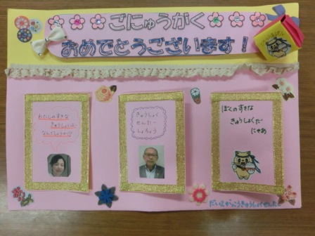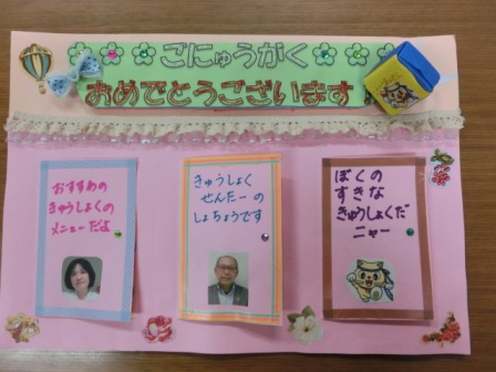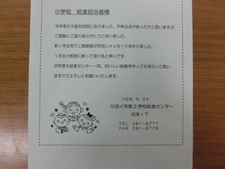 3月24日の修了式の日に、学校給食センターより、新1年生にお祝いのメッセージが届いています。心温まる素敵なメッセージカードをありがとうございました。新1年生の教室に飾らせていただきます。(工夫一杯のかわいいカードです。ランドセルが折り紙で作られ、にゃんたろうのランドセルカバーまでついています。めくると、センター長さんはじめ皆さんのとメッセージを見ることができます。本当にキラキラしてすごく素敵なカードです!)