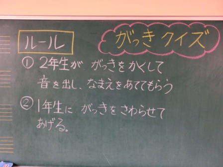 今日の3・4限目に2年生が「わくわくたんけん集会(1年生を迎える集会)」を行いました。1つ先輩の2年生が、学校の中を手をつないで案内したり、ゲームをしたりする集会です。