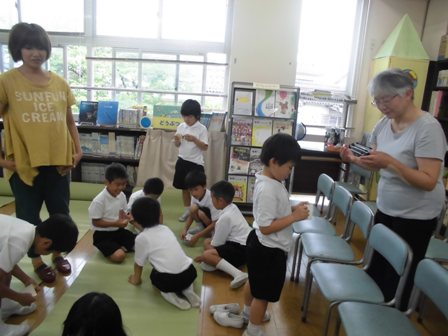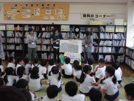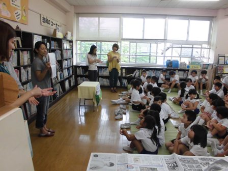 6月23日(木)の昼休みに、図書ボランティアさんによるミニミニお話会が行われました。プログラムは、手遊び、999ひきのおたまじゃくし、ぱっちん工作です。