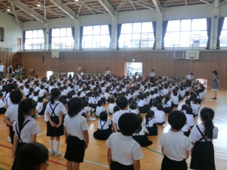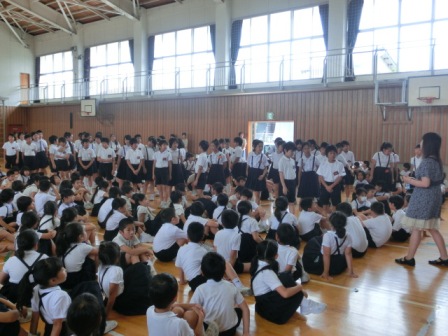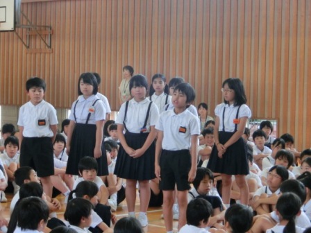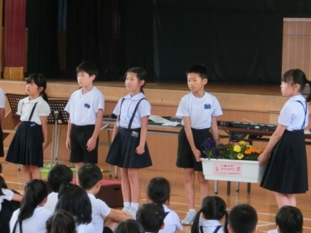 今日の3限目に全校集会が行われました。4年生から全校のみんなにお願いということで、「人権の花」=「思いやりの花」を自分たちと一緒に水やりをして育てて欲しいということでした。また今回の音読発表は2年生の担当でした。