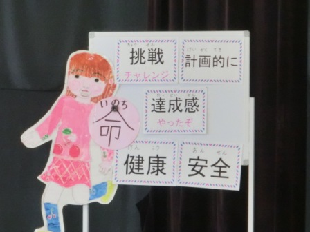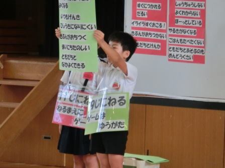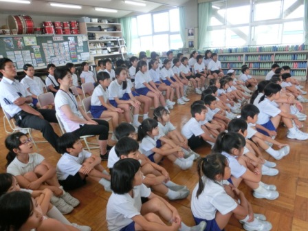 初めに図書担当から読書賞の表彰、次は私の話。内容は、①1学期のふりかえり②「あとまわしおばけ」の話とその退治の仕方(計画を立てて宿題をすること、夏休みだからこそ自分のおもしろいとおもえることに挑戦・チャレンジすること)③命の大切さ(交通事故や水の事故に遭わないように、自分の命は自分で守ること)でした。