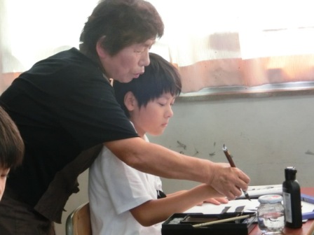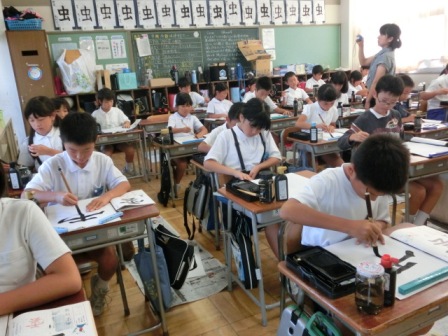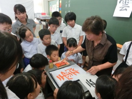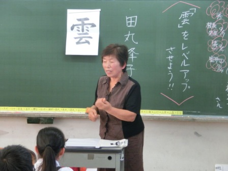 今日の2限と3限に、4年生が習字のレベルアップを図ろうと、地域の田丸さんをゲストティーチャーに招いて授業を行っていました。