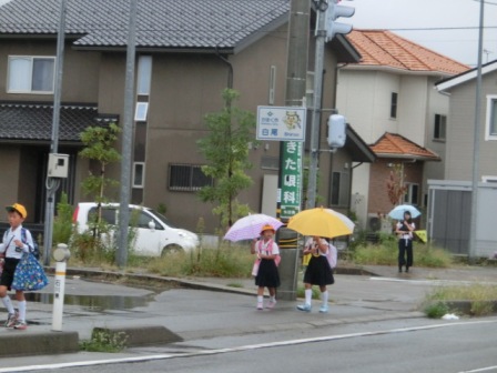 昨日の朝の風景です。保護者の皆様、朝の交通安全街頭指導、ありがとうございます。昨日は台風の影響で天候が悪く、交差点に立って頂き、本当に有り難かったです。また、「おはようございます」「いってらっしゃい」の声かけもして頂き、温かい気持ちになりました。今日、写真は撮れませんでしたが、市長さんや市の職員の方々も来て下さり、登校を見守ることができました。日々、当番活動として割り振らせて頂いています。お忙しい中、子どもたちのために、ありがとうございます。とても助かっています。