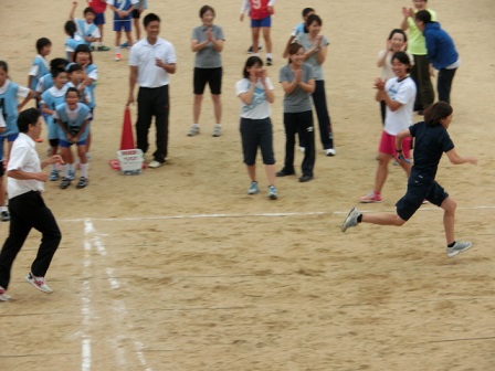 今日の昼休み、本校恒例?のリレー対決が行われました。運動会のリレーの補欠だった子どもたちは、練習にずっと参加してくれたクラスの代表ですが、本番では出番がありませんでした。そこで本番さながらに、先生たちと対決するというものです。スタンドにもたくさんの子どもたちが出てきて応援します。(今年はピストルまで使っていました。)これまで、先生たちが圧勝していたのですが、今は・・・・。私の隣で応援していた子は、「先生が全力なんて、大人げない・・・」等と、さすがとも言える?一言をつぶやいていました。(さすが高学年!)さてさて結果は?