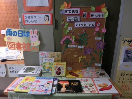 先日お知らせした、図書室にあったすてきな掲示板と本が、児童玄関に並びました。紹介します。昨日は晴れましたが、今後はあまりお天気がよくないようです。雨の日は図書館へレッツ・ゴーですね。