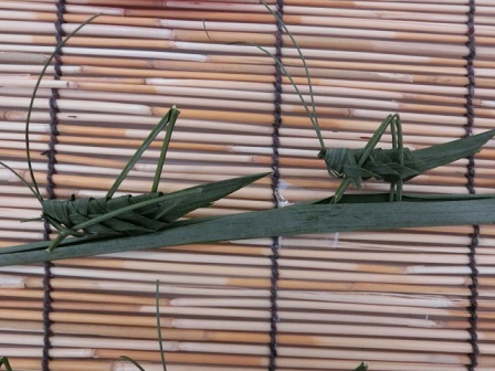 このバッタはコミュニティスクールのコーディネーター、駒井先生の手作りです。何の葉っぱだったでしょうか・・・。シュロ??