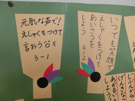 今月の生活目標もあいさつです。会釈がついてバージョンアップしたクラスもあります。