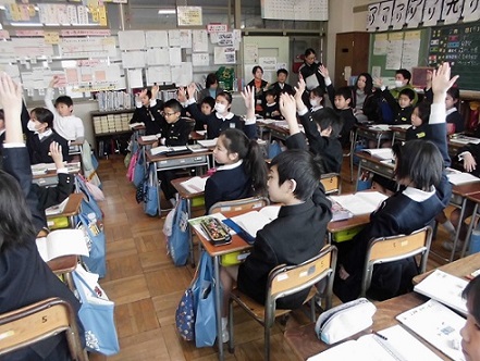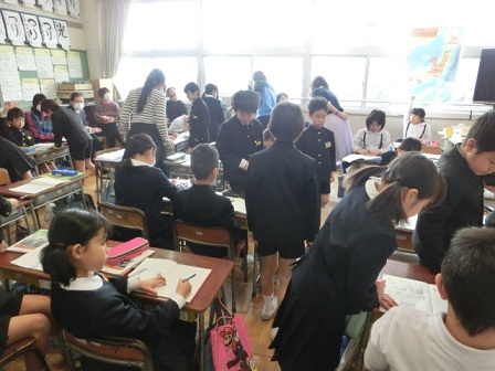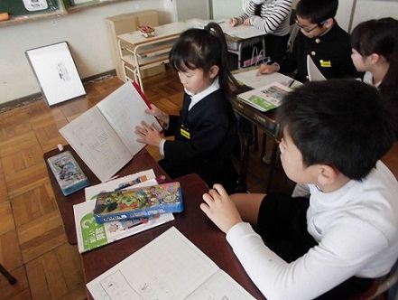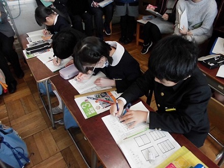 今日、3年生のクラスで研究授業が行われました。分数の勉強でした。前の時間考えたことと比べて、今の時間の問題はどこがレベルアップしているのか、何ができるようになればいいのかなどを初めに確認していました。自分でノートに図や式を書いて、ペアで相談したり、ミニ先生が教えに行ったりなど、一生懸命考えていました。最後の最後まで、勉強で追い込みです。