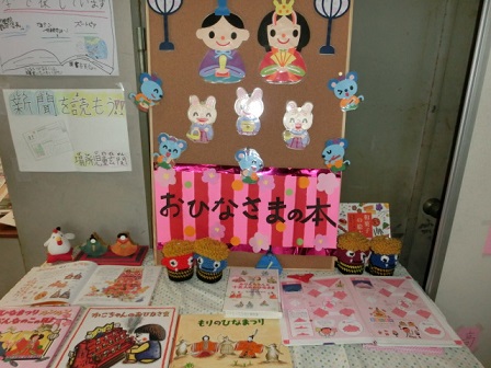 児童玄関の図書コーナーも模様替え 赤鬼や青鬼からおひな様へ