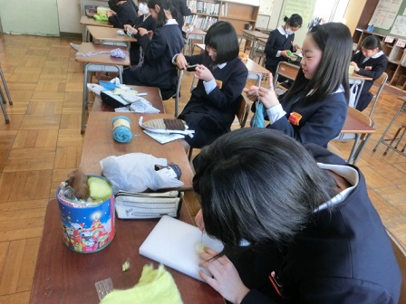 6年生を送る会が終わって、ありがとうの給食までの時間のことです。校長室では編み物教室のような風景がありました。ボランティアの皆さんが、アクリル毛糸で「たわし」を作って下さいました。お掃除の時間、洗面所磨きに使わせていただこうと思います。ありがとうございました!