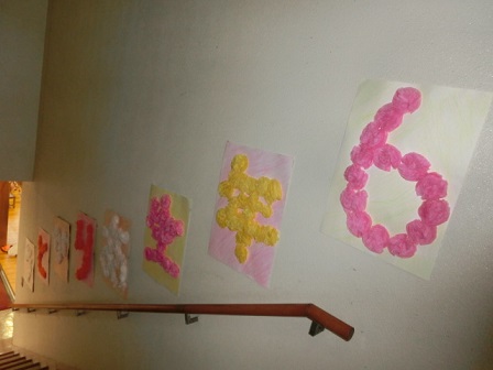 1年生は紙版画で作った思い出の学校生活です。カラフルな作品がずらっと廊下に並びました。通りかかった私が、「上手だね。廊下がパッと明るくなったね」と伝えると、一人の女の子が、「新しい学校みたい!」と言っていました。改修を控えた校舎をそう言ってくれる素敵さに感動しました。