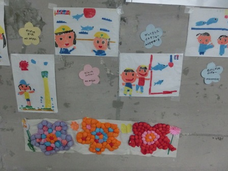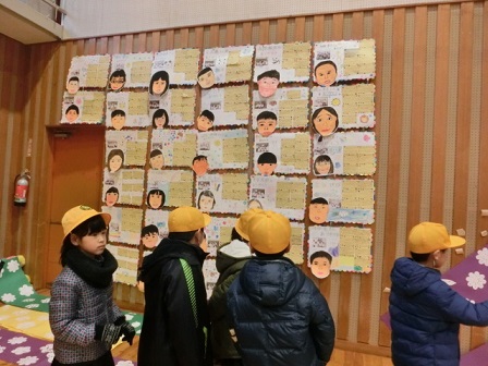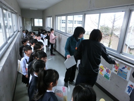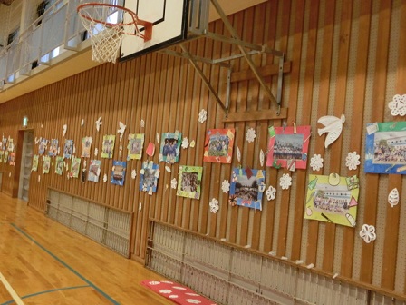 1年生は紙版画で作った思い出の学校生活です。カラフルな作品がずらっと廊下に並びました。通りかかった私が、「上手だね。廊下がパッと明るくなったね」と伝えると、一人の女の子が、「新しい学校みたい!」と言っていました。改修を控えた校舎をそう言ってくれる素敵さに感動しました。