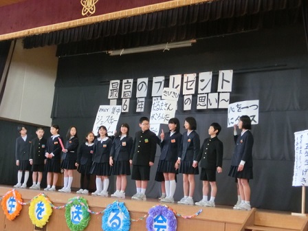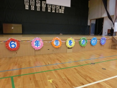 今日、「最高のプレゼント~6年生への思い~」のスローガンのもと、6年生を送る会が行われました。みんなのありがとうの気持ちがたくさん詰まった、まさしく最高のプレゼントを贈ることができた会となりました。また、それぞれの学年の成長が見取れる会ともなりました。見守って下さった来賓(お世話になった地域の方々)の皆様、保護者の皆様、ありがとうございました。