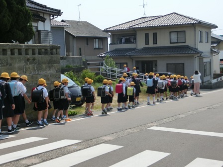 今日の午後、集団下校訓練が行われました。めあては、「安全な下校の仕方について知り、6年生を中心に協力して安全に下校することができる」です。まずは自己紹介をして、その後、自分たちのルートではどこが危ないのか、何に気を付けないといけないのかを話し、チームごとに2列を作り下校となりました。6年生は常にリーダーです。今後もよろしくお願いします。
