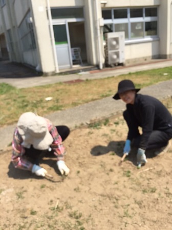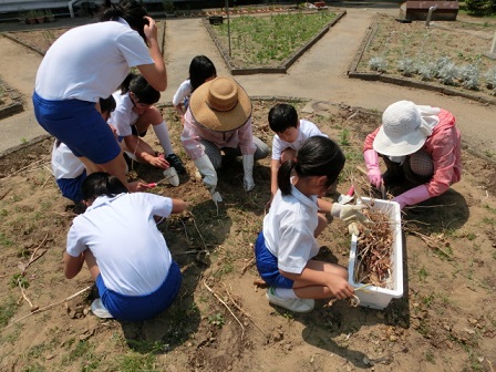 今日のお昼休みに、地区のボランティアさんが来て下さり、環境委員の子どもたちと、球根抜きや草むしりを行ってくださいました。子どもたちが授業に戻ってからも、ずっと草むしりをして下さり、中庭花壇がとてもきれいになりました。朝は曇っていたのに、午後からはお日様のさすお天気・・・暑い日となりました。本当にありがとうございました!