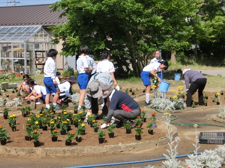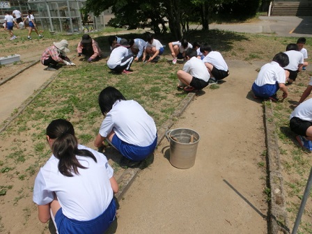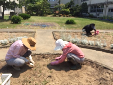 昨日の委員会活動の時間、中庭花壇で花植えが行われました。その際、環境委員のもとに、ありがたい助っ人の皆さんが来て下さいました。花植えボランティアの皆さんです。前回は草むしりで助けて頂き、今回は花植え・・・。一緒に植えながら、教えてもらうので、作業が大変スムーズに進みました。暑い日にもかかわらず、いつも助けて頂き、ありがとうございます。
